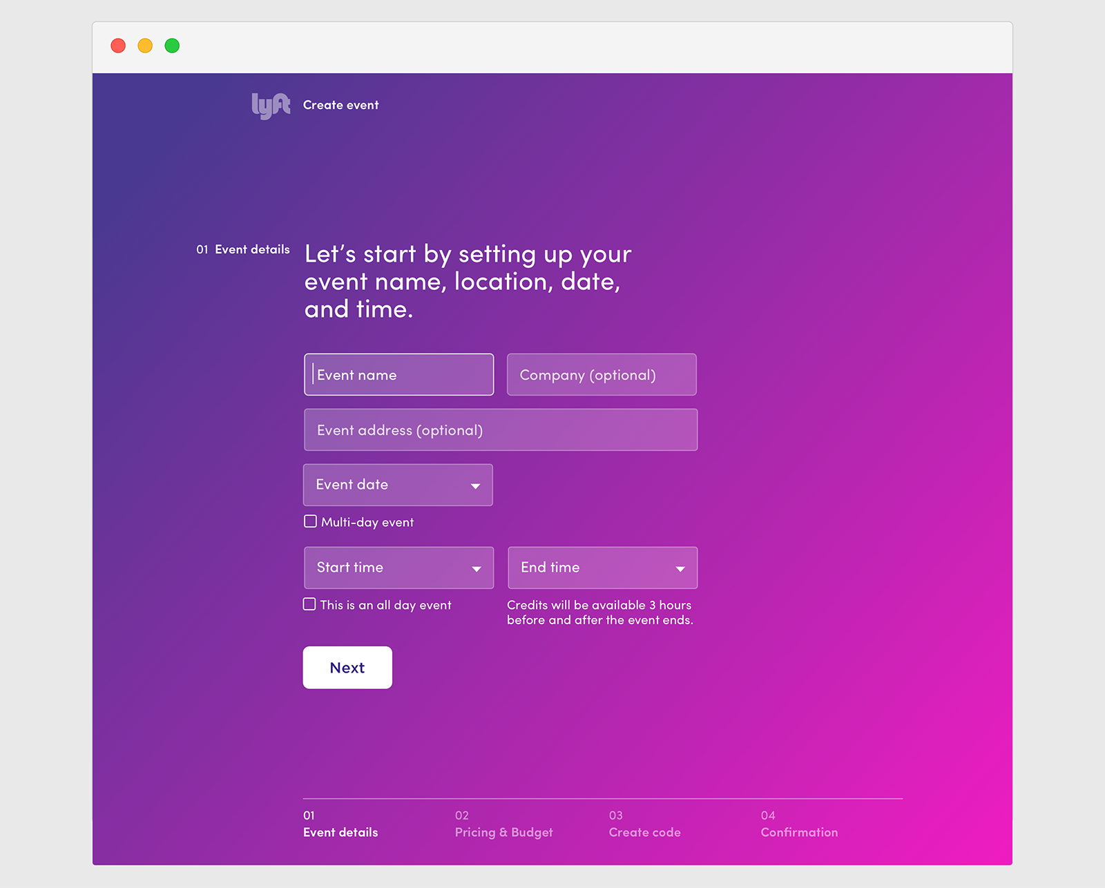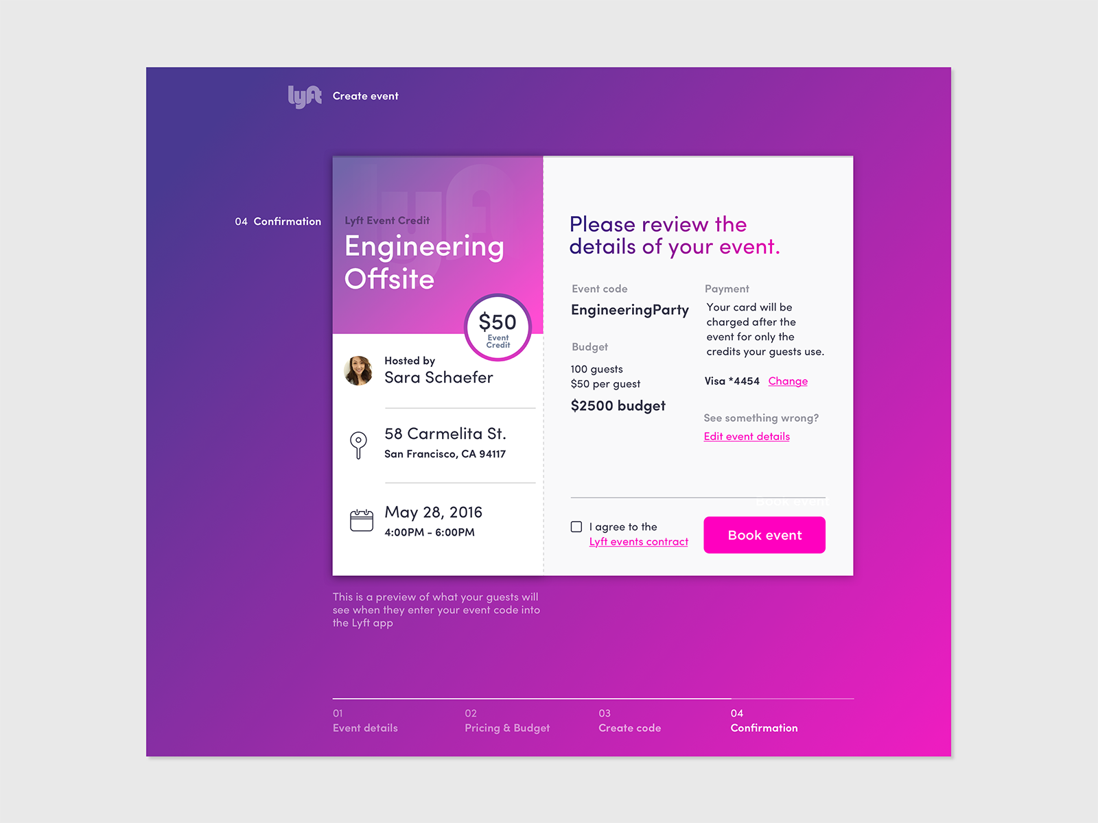 Whether it's a corporate event or a wedding, we wanted to make it easy to buy a Lyft ride for someone else. Lyft Events allow organizers to create a time and geo-restricted code that can be easily shared with their guests.