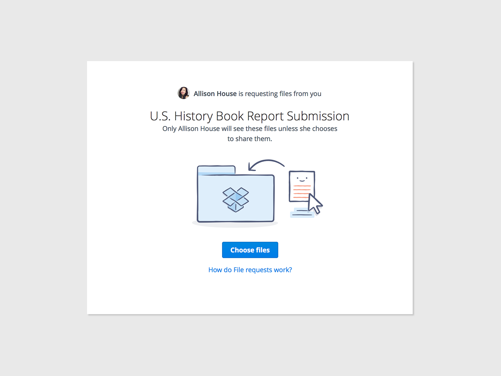We created File requests to help people use Dropbox to collect files from a group of people. File requests are secure and private - people can easily upload and send files to the requestor, but won't have visibility into the requestor's Dropbox or see previously submitted files.