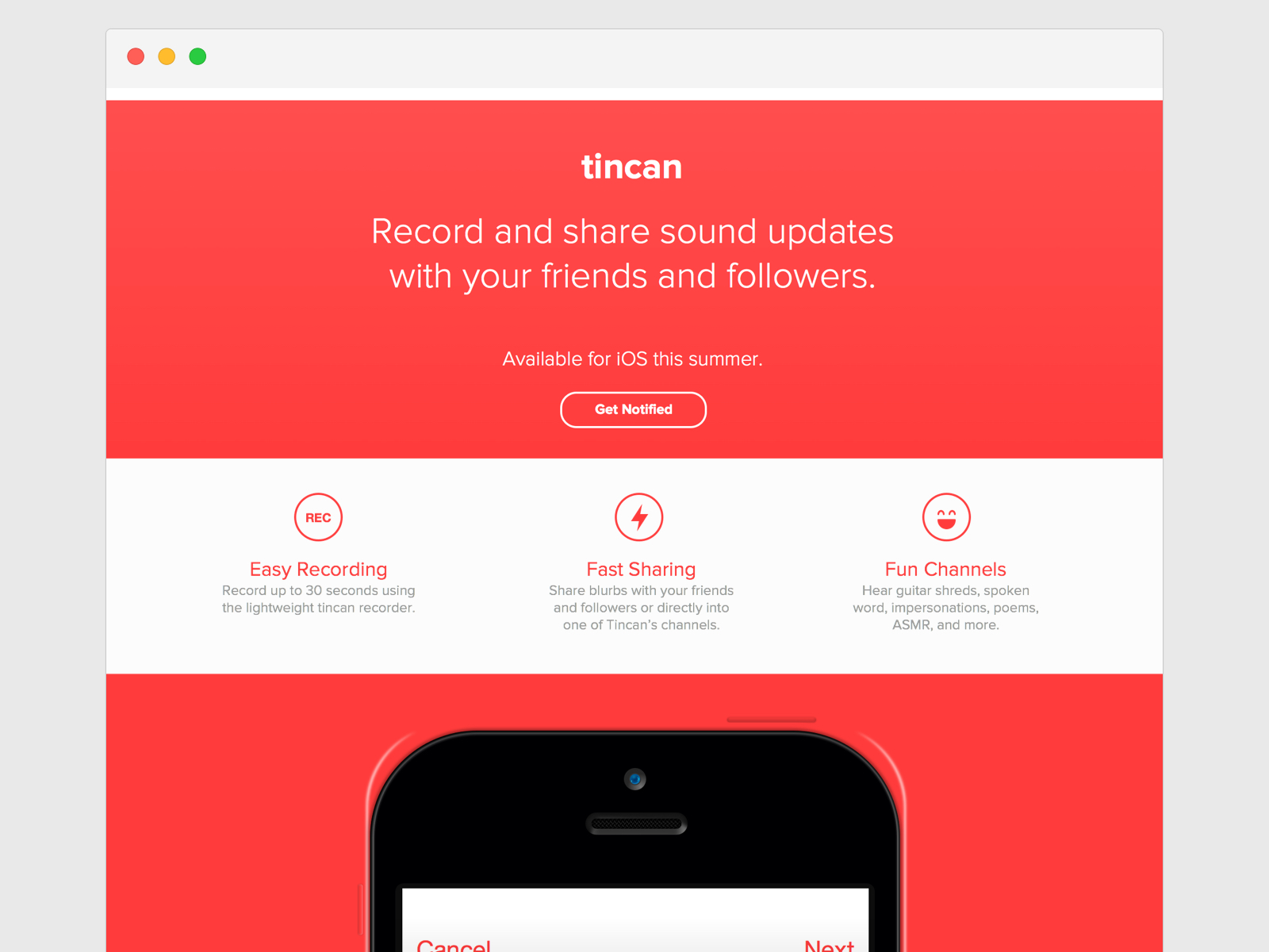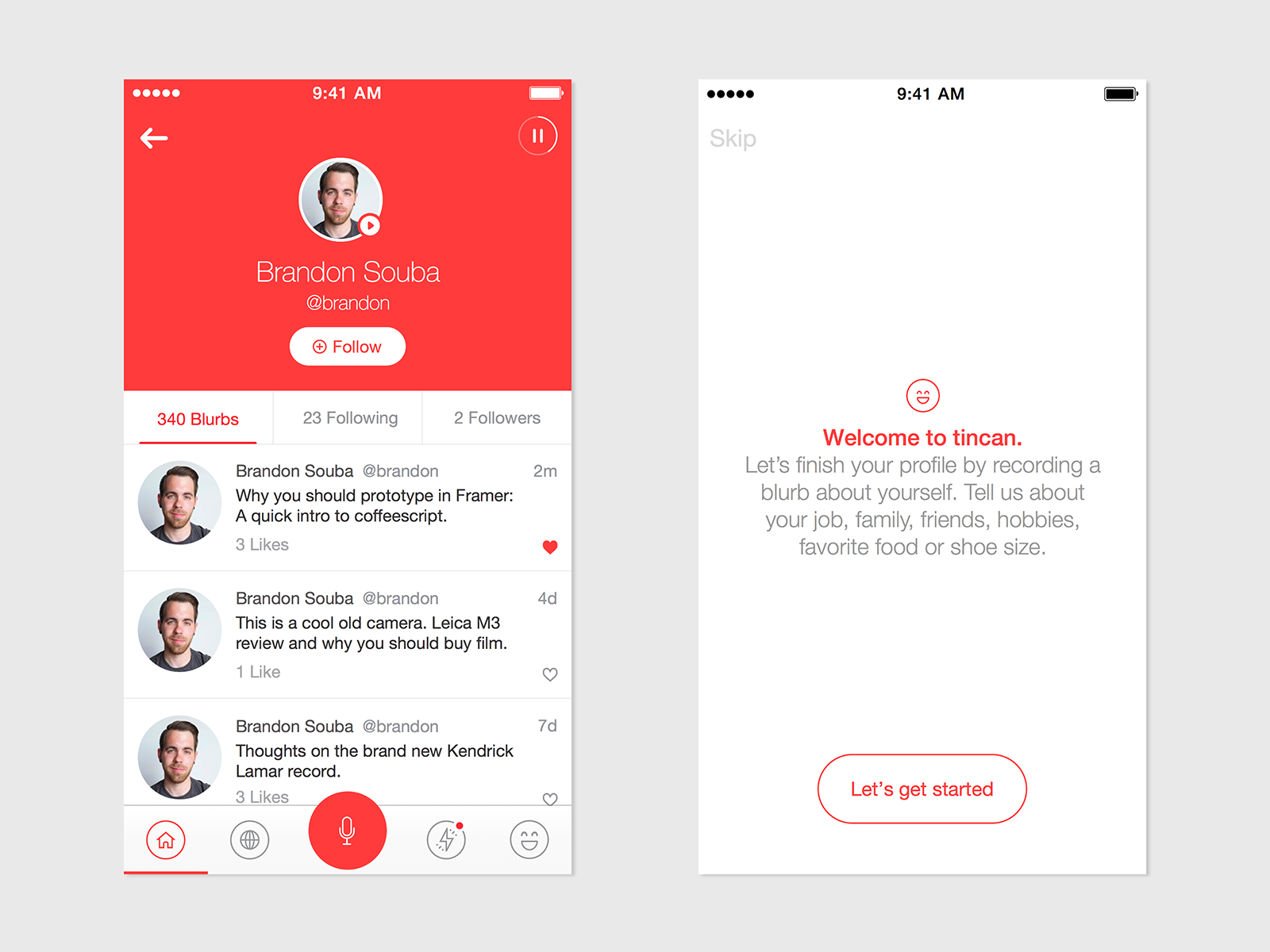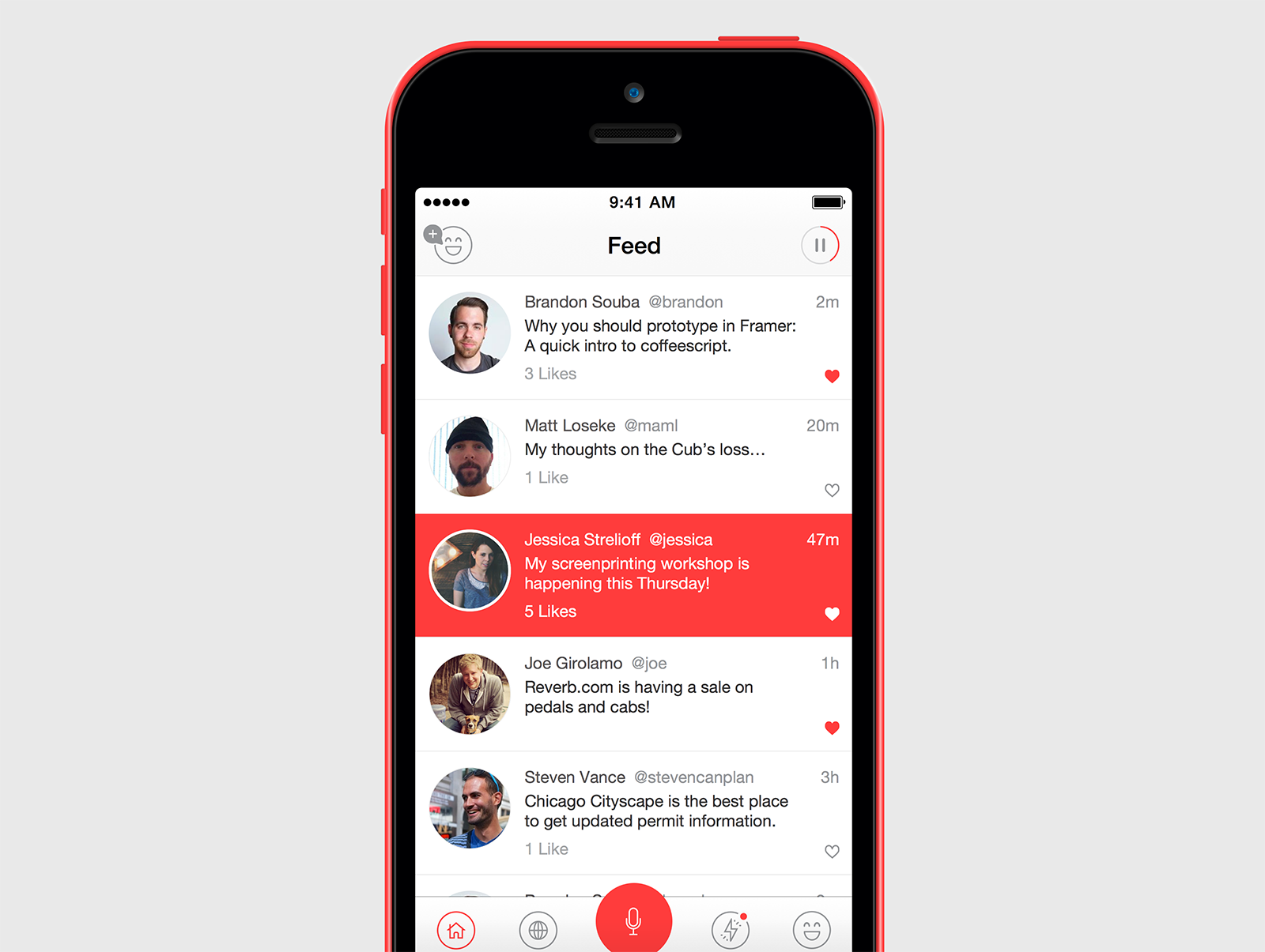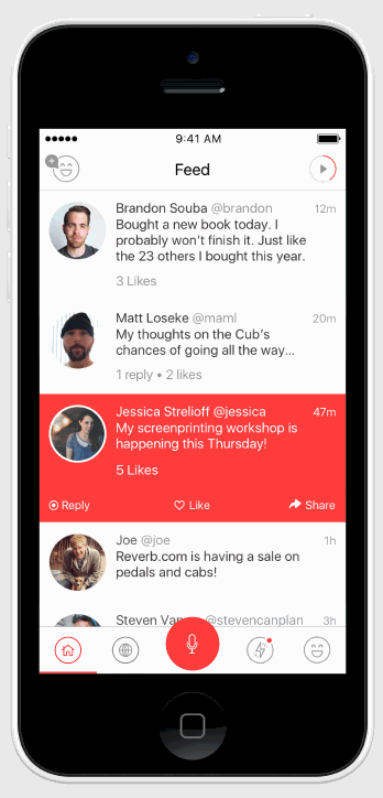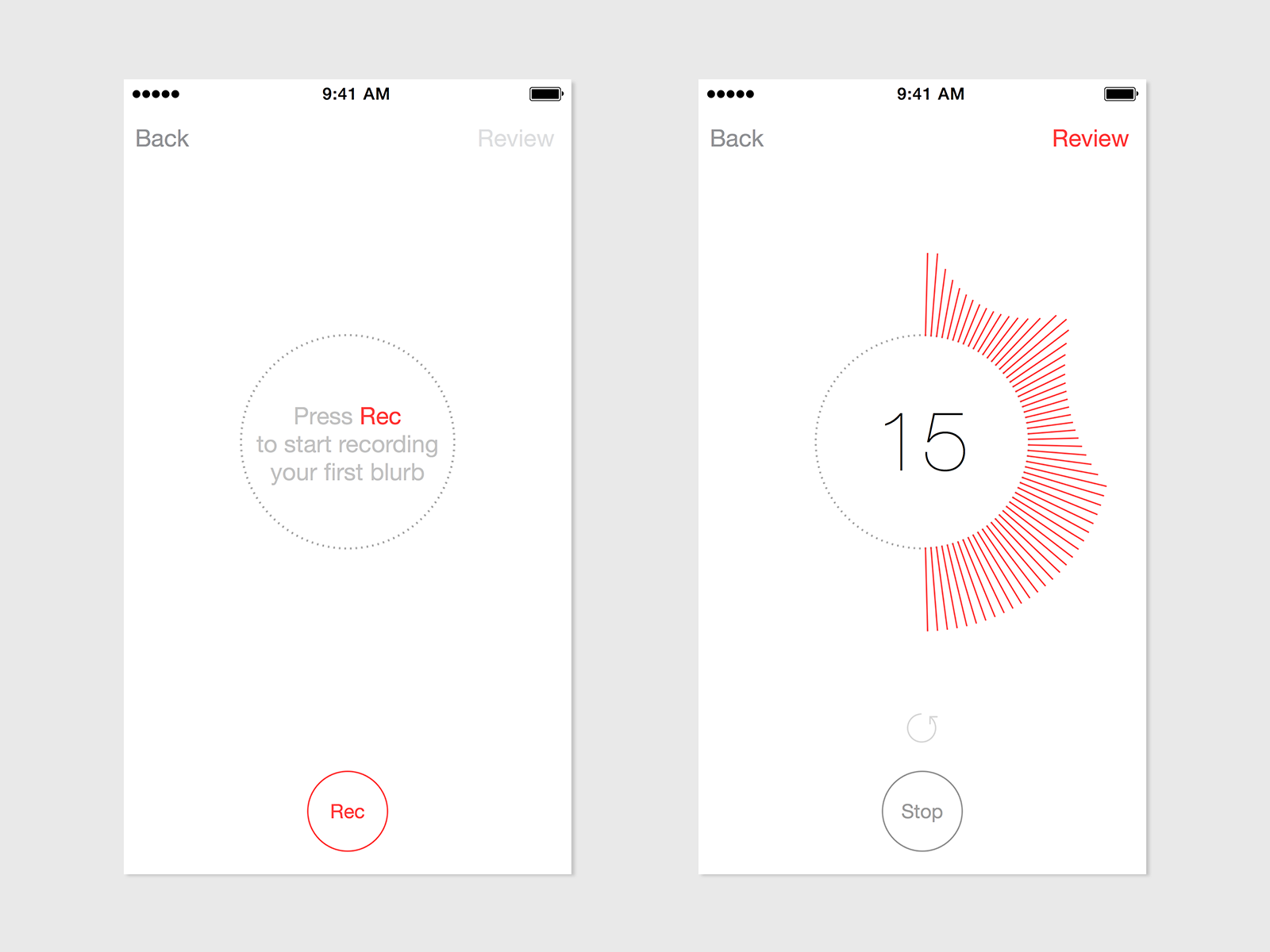 We created an app to share short sound blurbs with your friends and followers. Jokes, status updates, and random thoughts are elevated due to sound's intimate qualities. An ambient track is played behind the blurbs to seamlessly connect each expression.